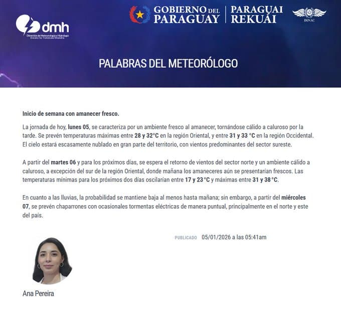 El comienzo de la semana trae un clima cambiante en todo el país. Este lunes 05 arranca con un ambiente fresco, sobre todo en las primeras horas de la mañana, cuando salir temprano puede sentirse agradable e incluso algo frío en algunas zonas. Sin embargo, a medida que avanza el día, el panorama cambia: el sol y el aumento gradual de la temperatura harán que la tarde se vuelva cálida e incluso calurosa en gran parte del territorio nacional.