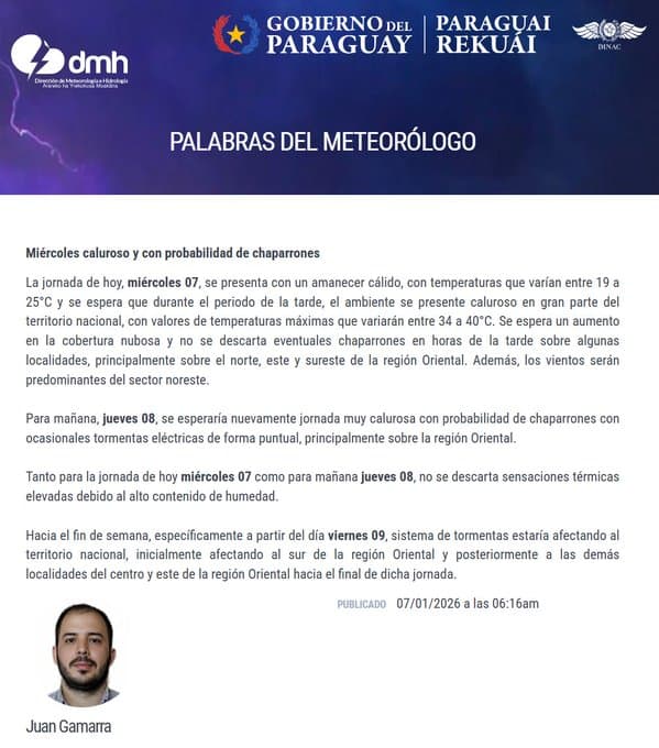 A partir del viernes 9 se espera que el clima empiece a cambiar. Un sistema de tormentas ingresaría primero por el sur de la región Oriental y, con el avance del día, podría extenderse hacia el centro y este del país. Este frente será clave para definir cómo se desarrollarán las lluvias y tormentas en los días siguientes.