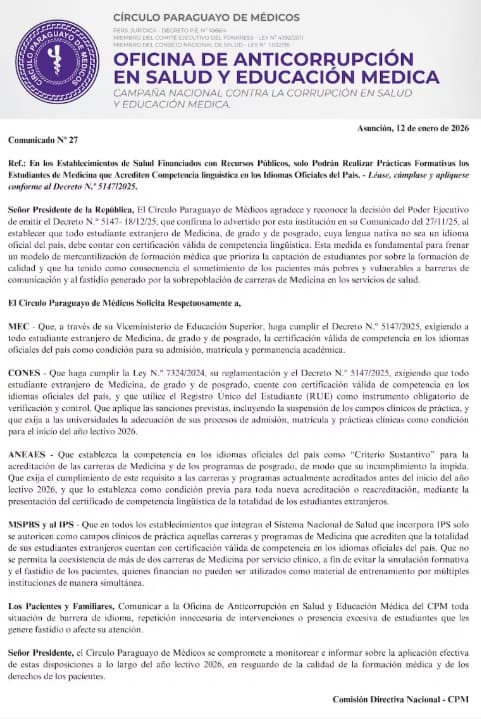 El uso del guaraní y el castellano en los hospitales volvió al centro del debate público. El Círculo Paraguayo de Médicos reclamó al Gobierno mayor control para que estudiantes extranjeros acrediten competencia lingüística antes de realizar prácticas clínicas.