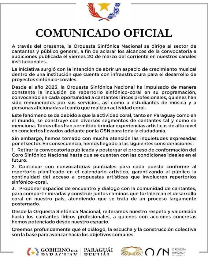 Tras analizar las reacciones del sector, la OSN decidió retirar la convocatoria. Además, anunció que el proceso de conformación del coro será postergado. “Se posterga hasta contar con las condiciones ideales”, indicaron.
