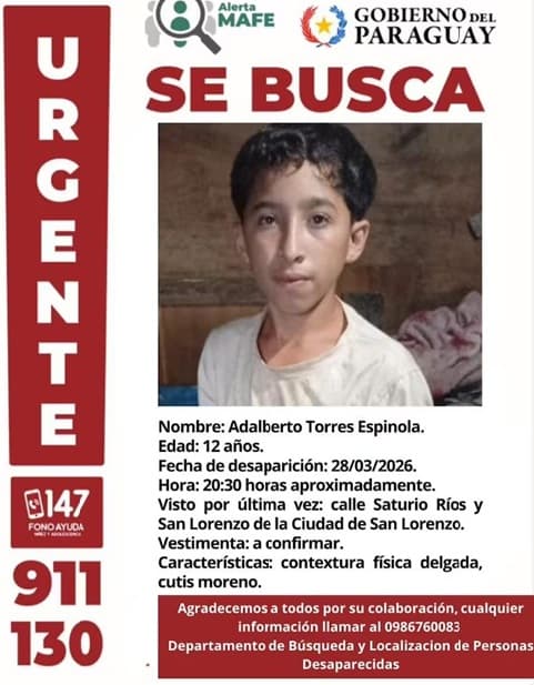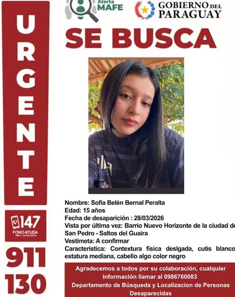 Entre las personas buscadas está Sofía Belén Bernal Peralta, de 15 años. Fue vista por última vez el 28 de marzo en el barrio Nuevo Horizonte de San Pedro, en Salto del Guairá. También figura Adalberto Torres Espínola, de 12 años, visto por última vez el 28 de marzo sobre Saturio Ríos, en San Lorenzo.