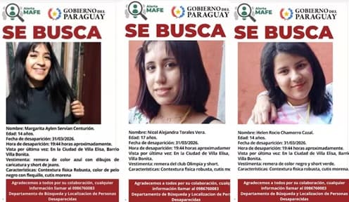 Además, las autoridades buscan a tres adolescentes vistas por última vez el 31 de marzo, cerca de las 20:00, en el barrio Villa Bonita de Villa Elisa. Una de ellas es Margarita Aylen Servián Centurión, de 14 años. Vestía una remera azul con caricaturas y un short de jeans.