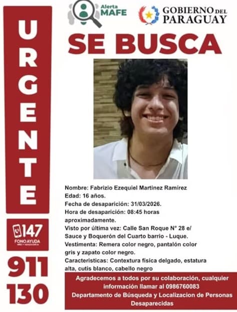 Otro de los casos corresponde a Fabrizio Ezequiel Martínez Ramírez, de 14 años. Fue visto por última vez el 31 de marzo entre las calles San Roque y Sauce del Cuarto Barrio de Luque. Al momento de su desaparición vestía remera negra, pantalón gris y calzados negros.