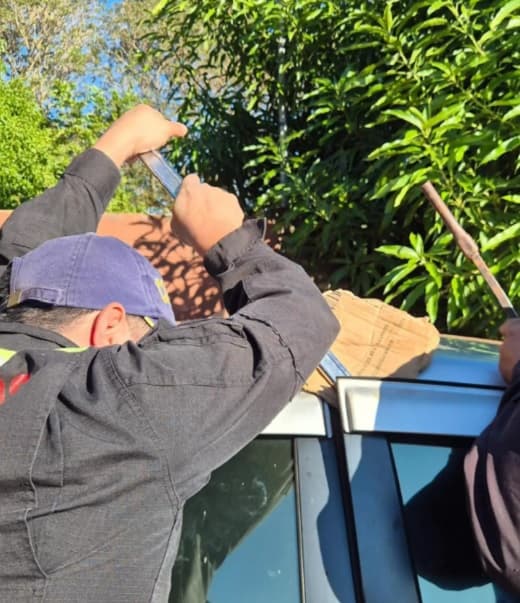 Además, colocaron un cartón en la zona de apertura con el objetivo de proteger el vidrio y prevenir cualquier posible lesión. La maniobra fue ejecutada con cautela, teniendo en cuenta la edad de la menor y el espacio reducido dentro del automóvil.
