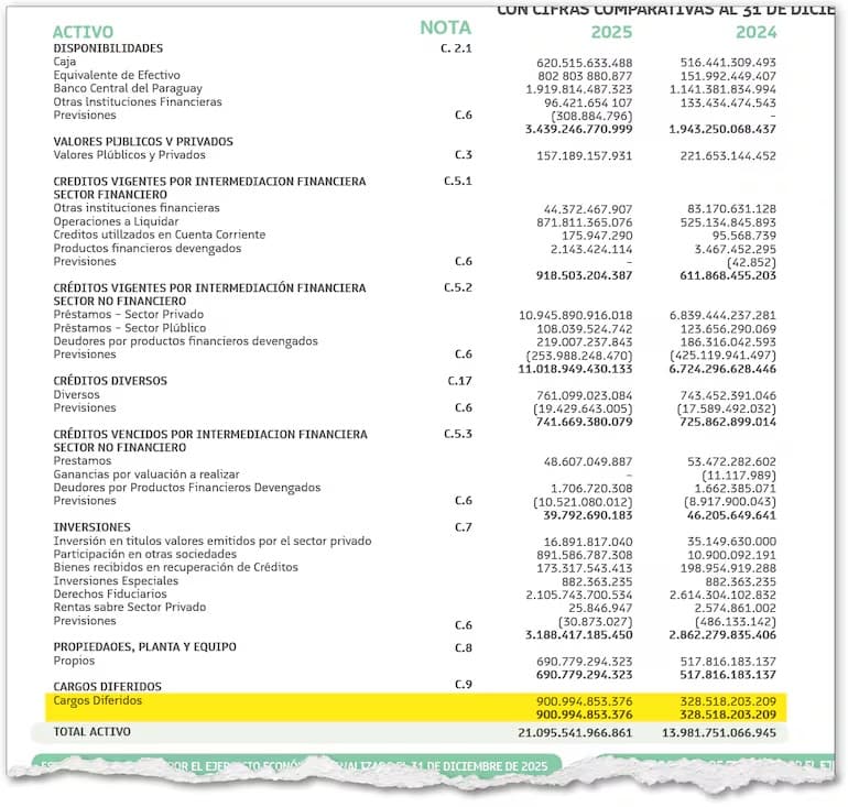 El beneficio permitió trasladar la carga de una cartera deteriorada de aproximadamente G. 2 billones. De esta manera, la entidad evita afectar sus utilidades actuales. Al cierre de 2024, la cuota anual de estos cargos diferidos alcanzó G. 87.077 millones.