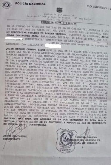 El director del Mercado Central de Abasto, Carlos García, fue denunciado ante la Policía Nacional por una presunta agresión física. El denunciante es Jaime Domínguez, un permisionario cuya familia trabaja en el sitio desde hace años. El hecho violento habría ocurrido en las oficinas de la Municipalidad de Asunción el pasado 9 de abril. Según el afectado, el incidente se desató durante un reclamo por una multa que considera injusta e irregular.