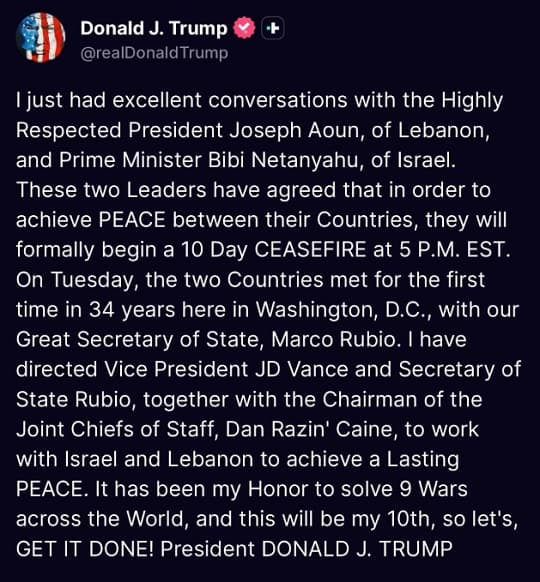 Alto el fuego entre Israel y Líbano: Trump anuncia tregua de 10 días